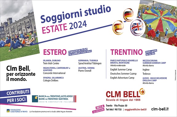 Anche per l’estate 2024 si rinnovano i contributi per i figli dei Soci attivi della Banca per il Trentino-Alto Adige per la partecipazione ai soggiorni studio e ai campi estivi di lingue di Clm Bell.